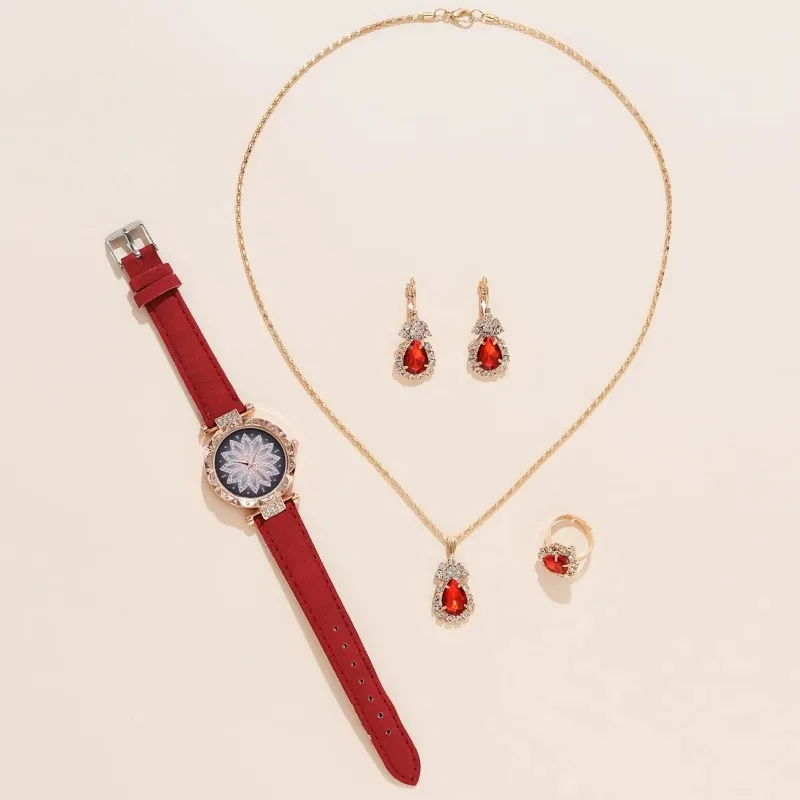 5/6PCS Set Rose Gold Luxury Watch Women Ring Necklace Earring Rhinestone Fashion Wristwatch Casual Ladies Bracelet( No Box)