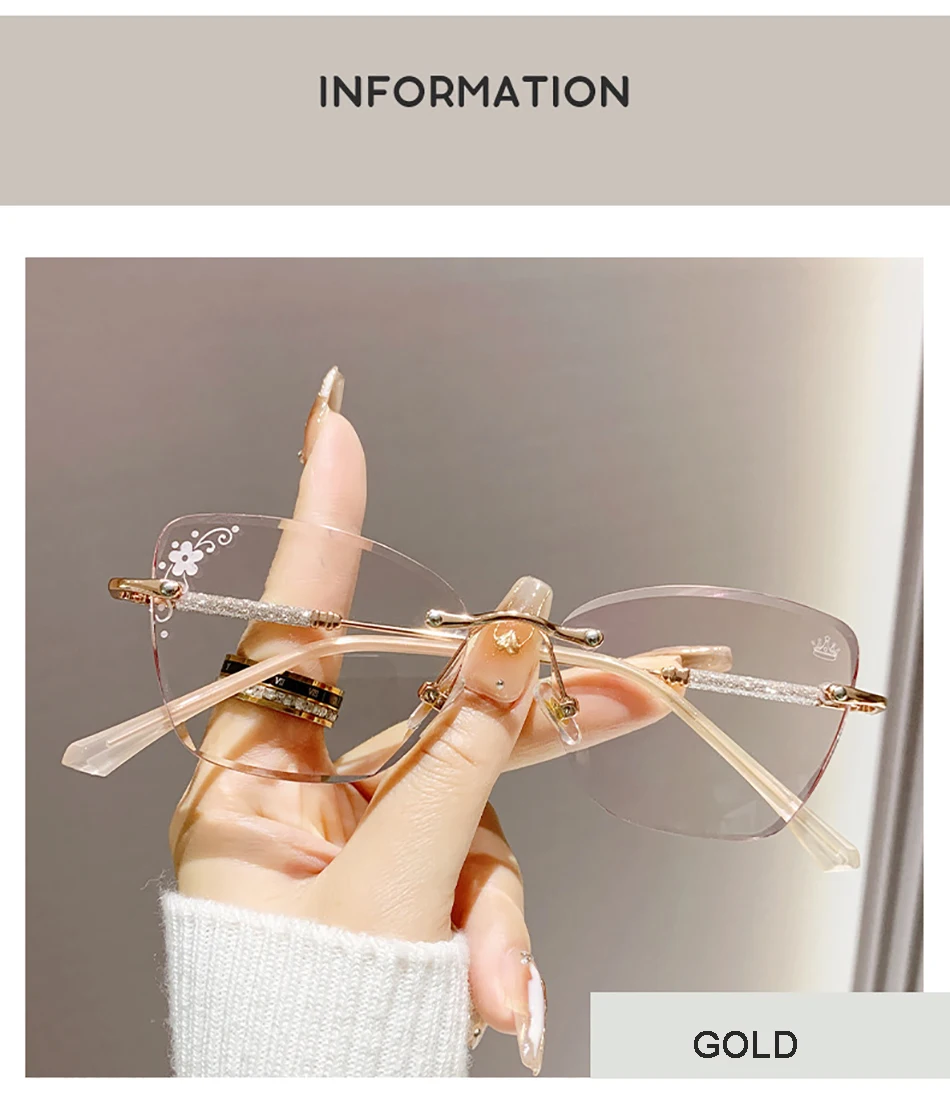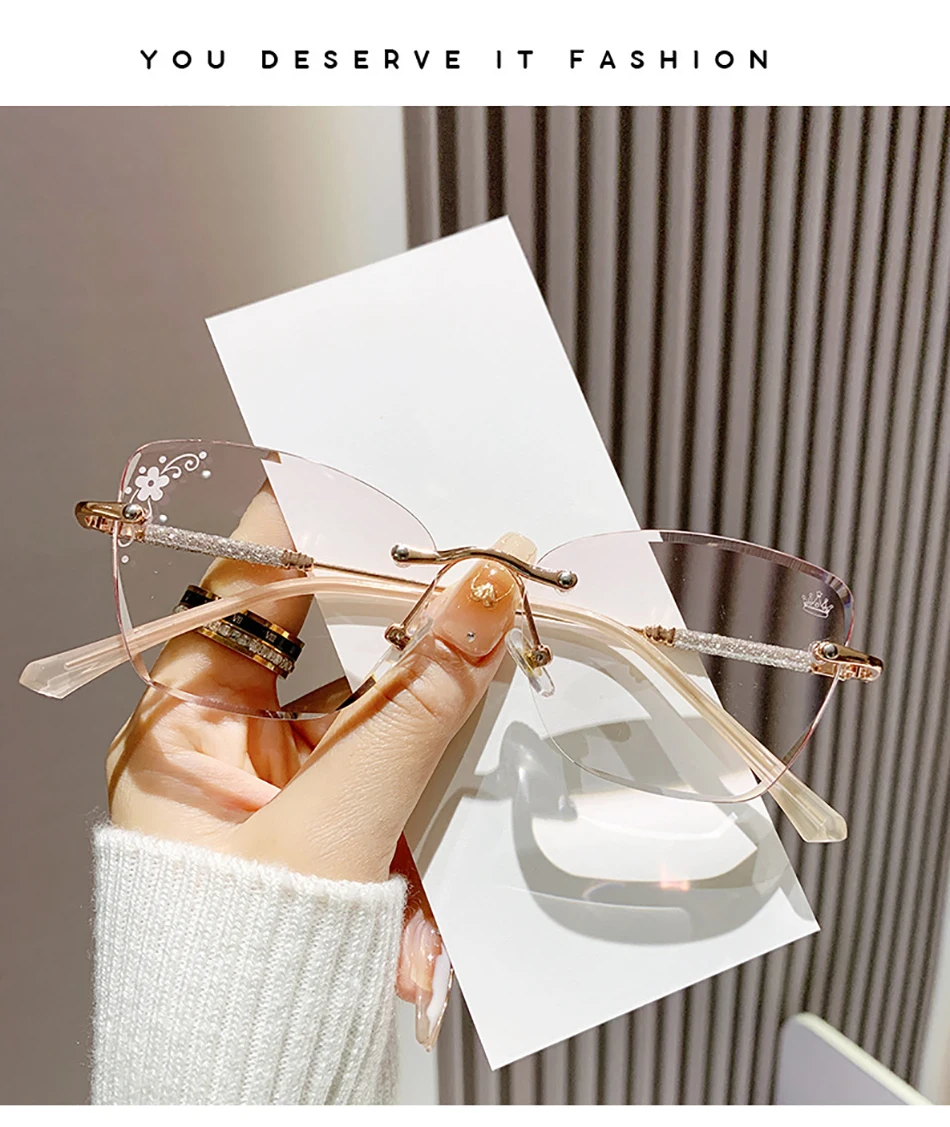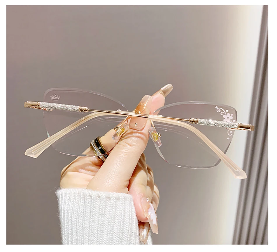 Chic Framless Cutting Reading Glasses Women Big Frame Cat Eyes Presbyopia Eyeglasses With Diopter +1.0+1.5+2.0+2.5+3.0+3.5+4.0