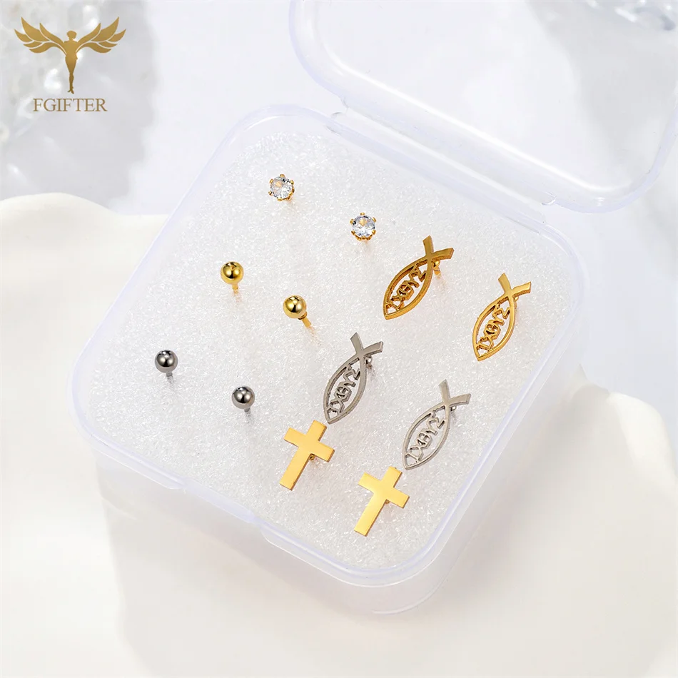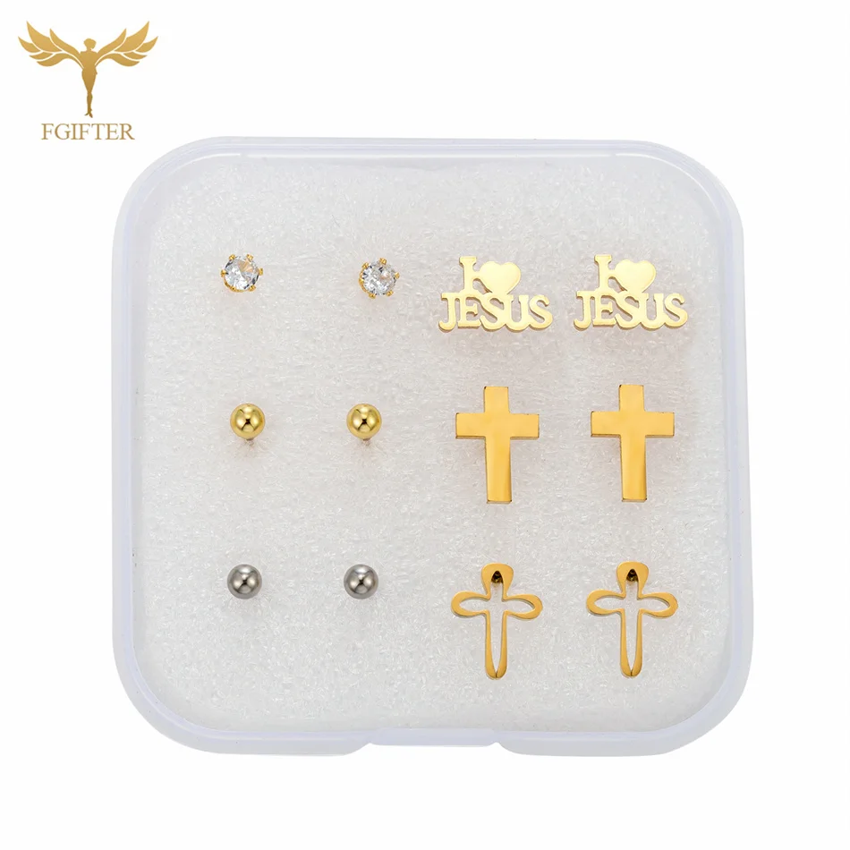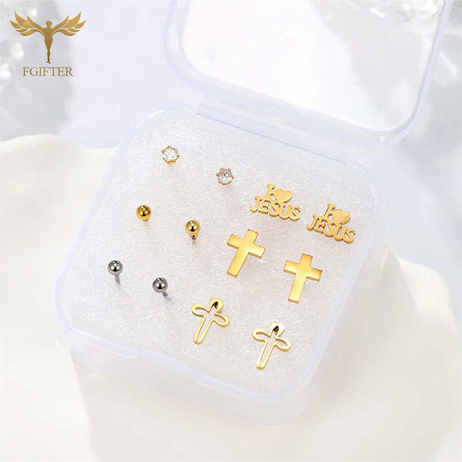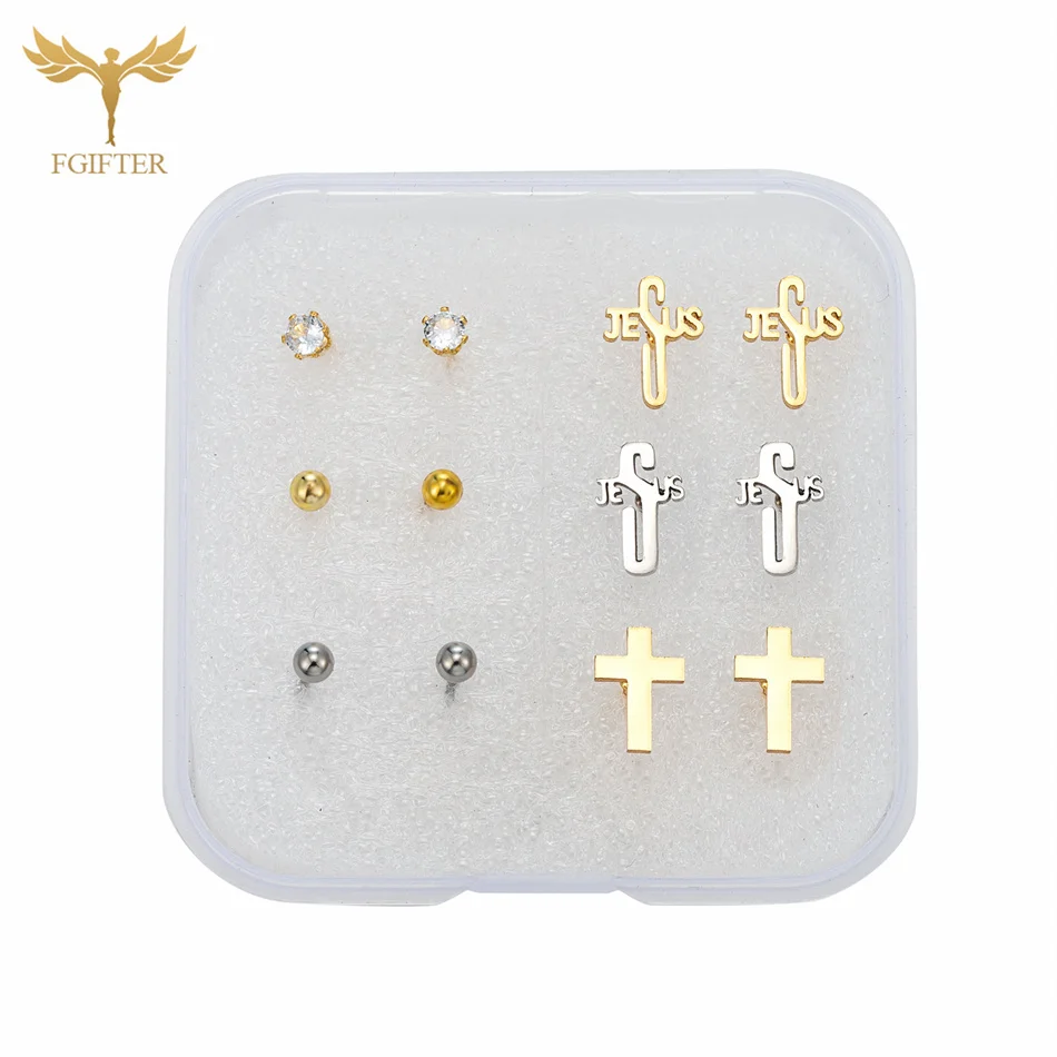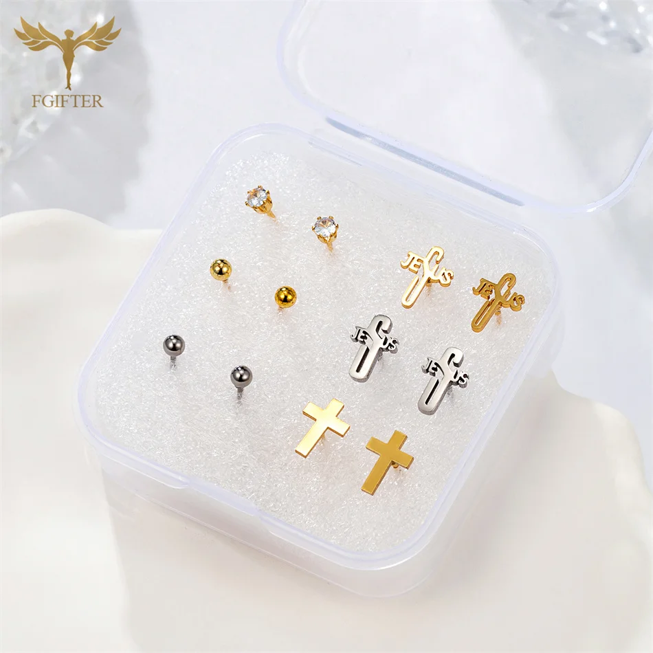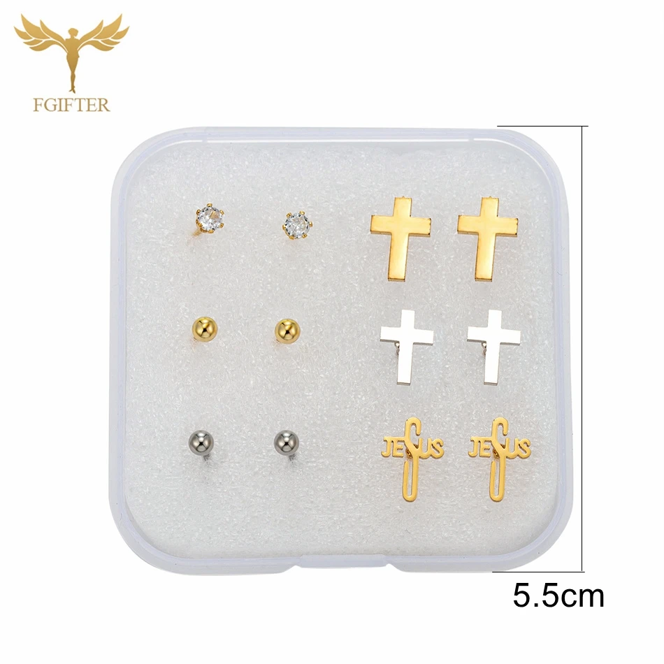 Christian Jesus Cross Earrings Zircon Balls Stainless Steel Stud Earings Set Women Men Jewelry Small Christmas Gifts With Box