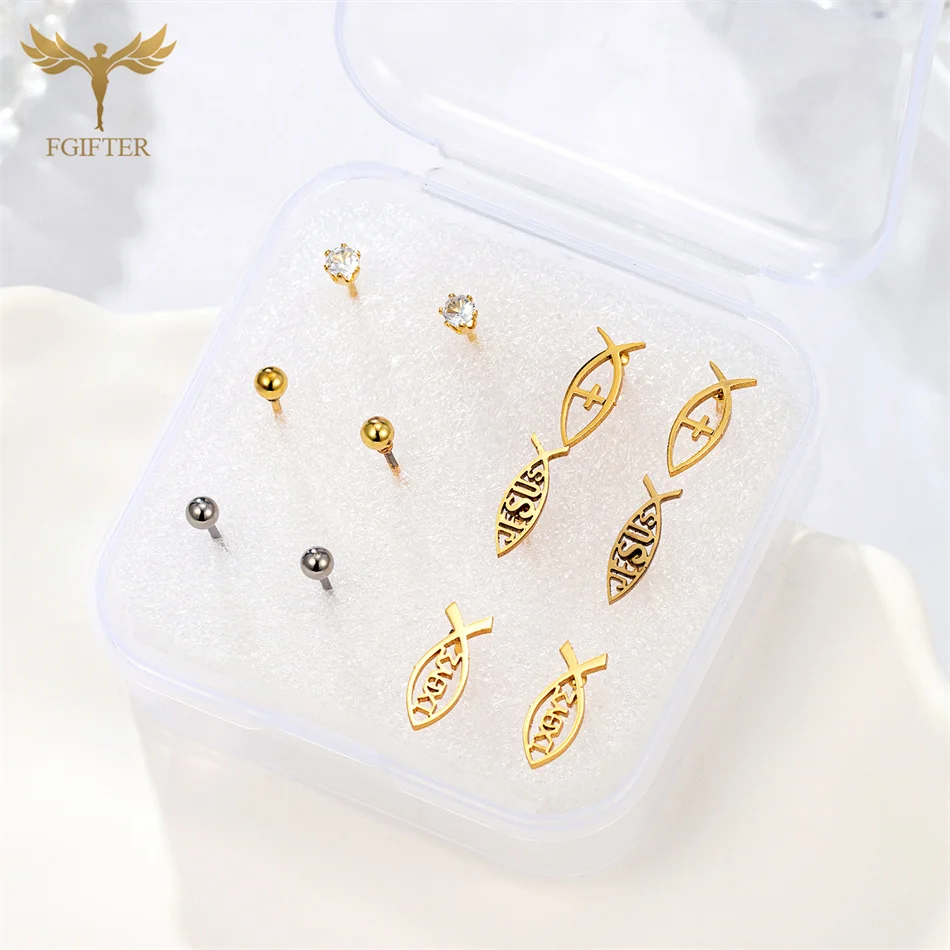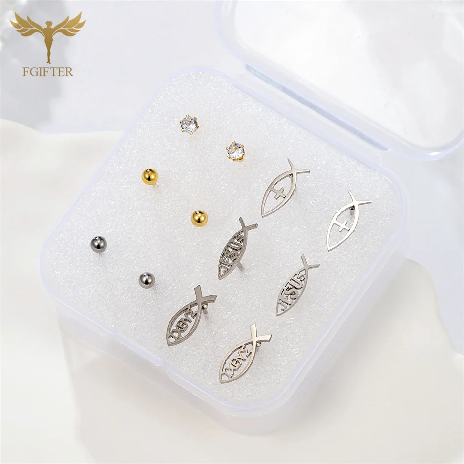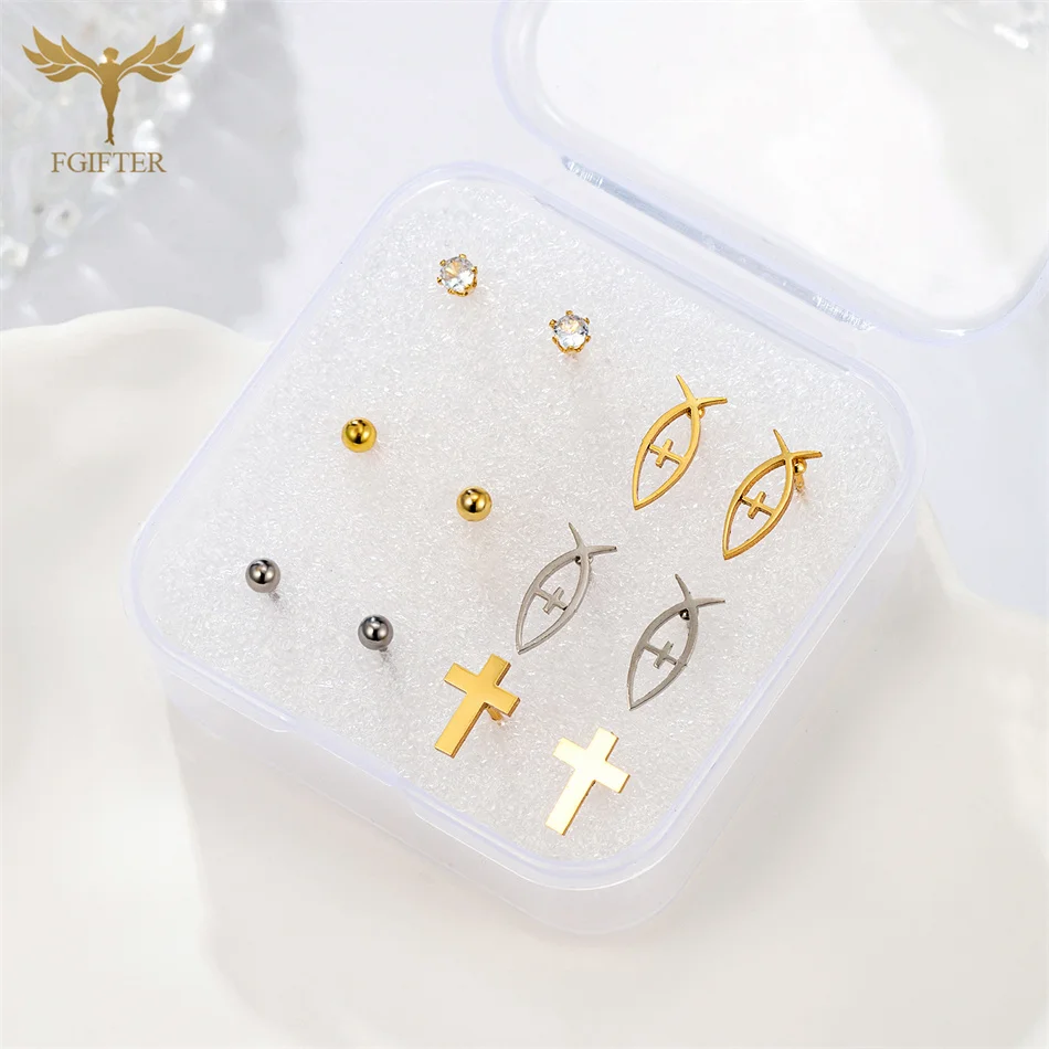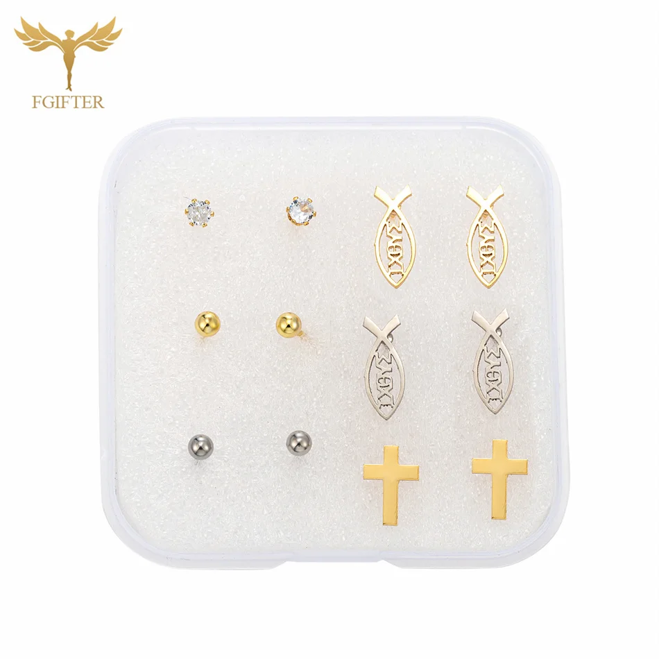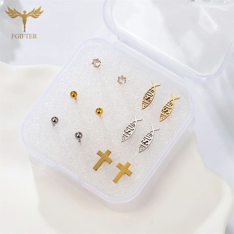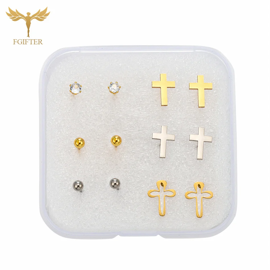 Christian Jesus Cross Earrings Zircon Balls Stainless Steel Stud Earings Set Women Men Jewelry Small Christmas Gifts With Box