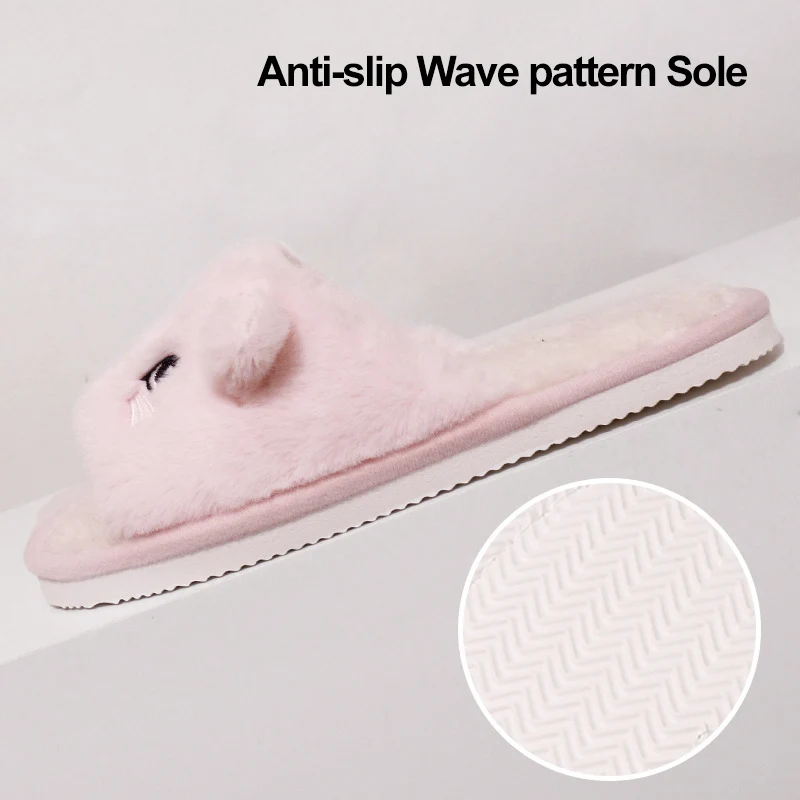 Cute Cartoon Cat Home Slippers for Women Open Toe Non Slip Wave Sole Faux Fur Slides Woman Autumn Winter Plush Indoor Slippers