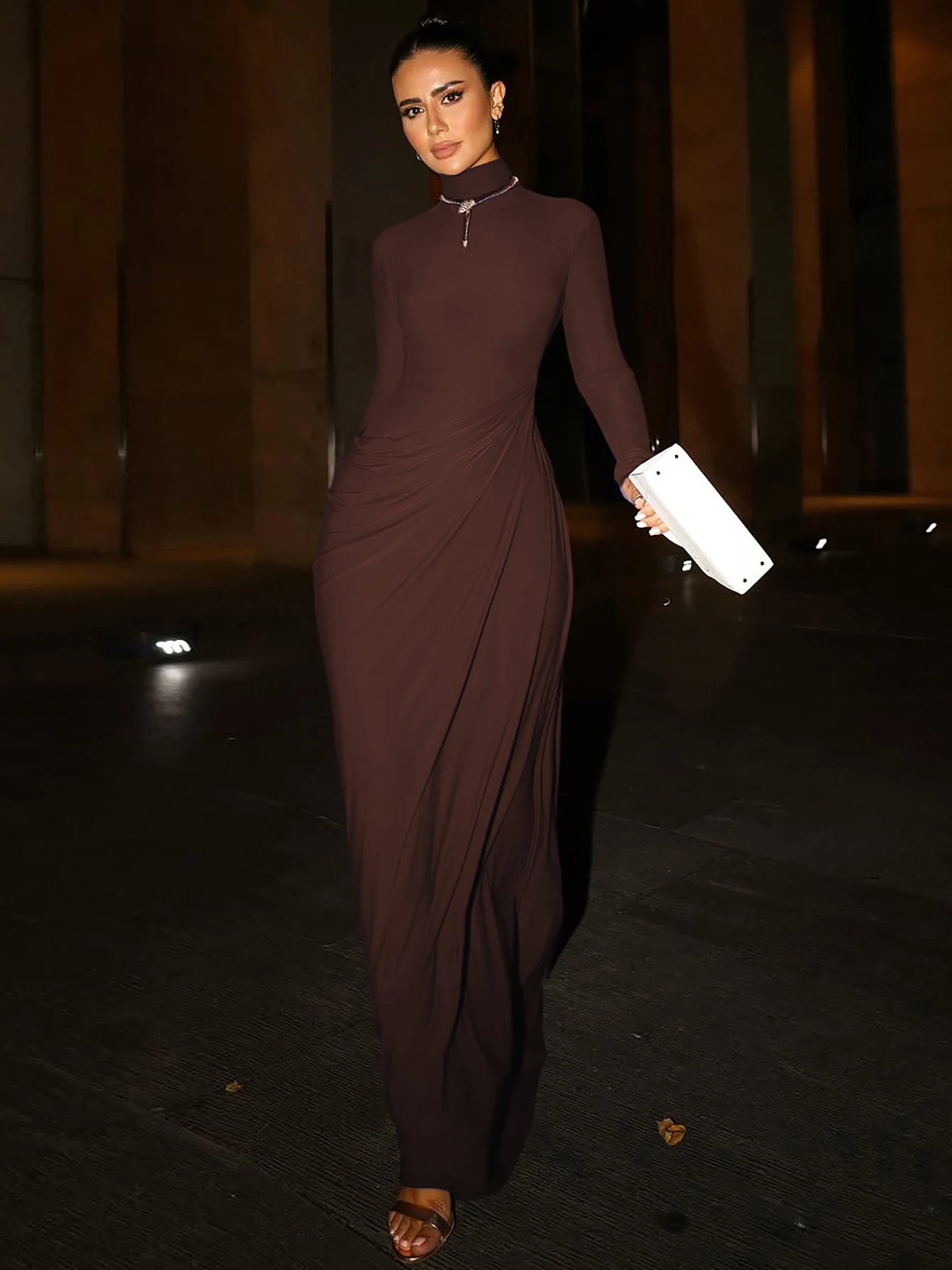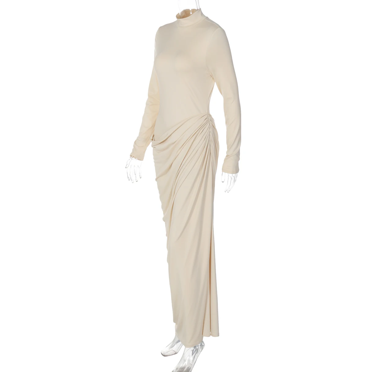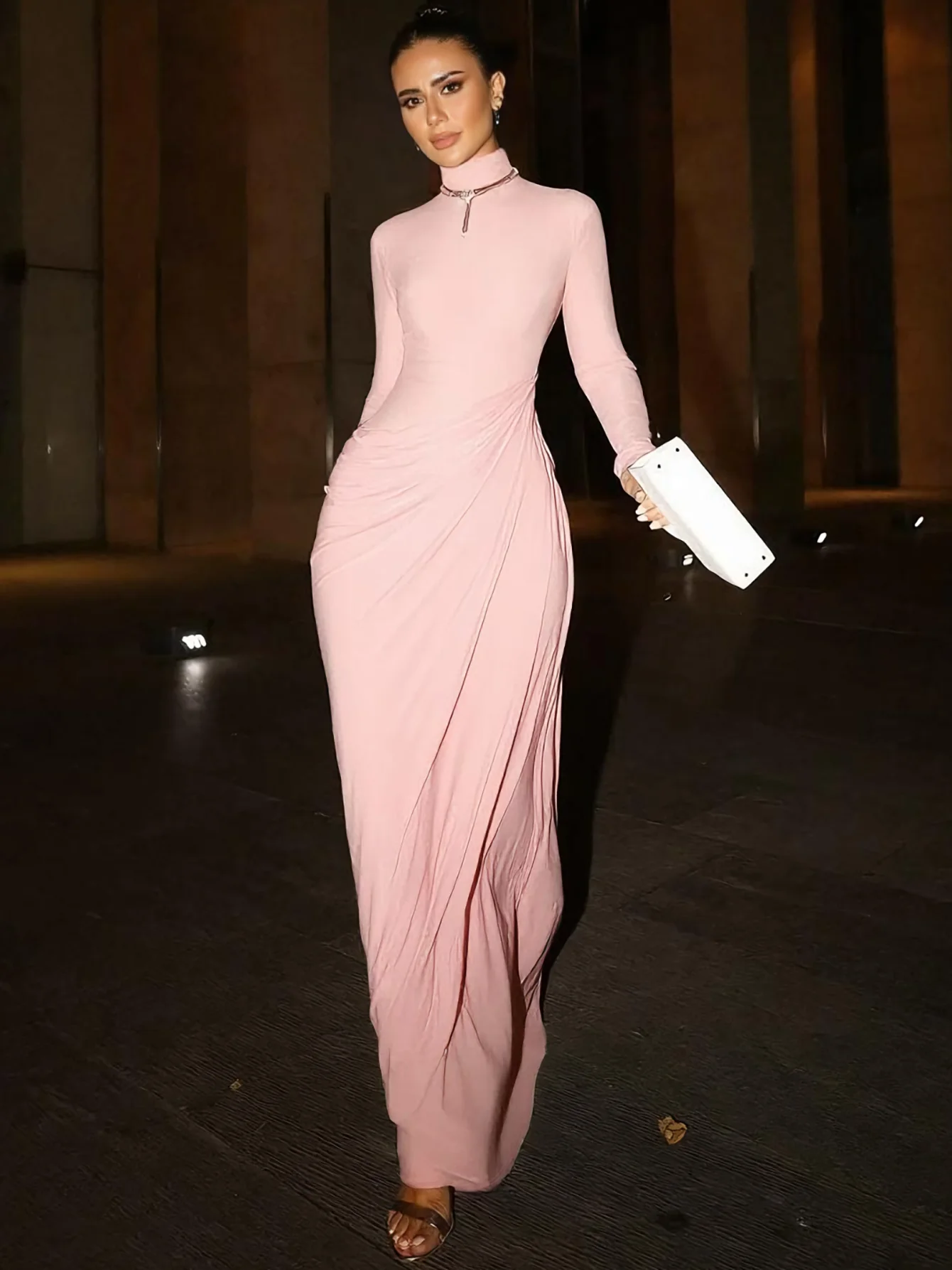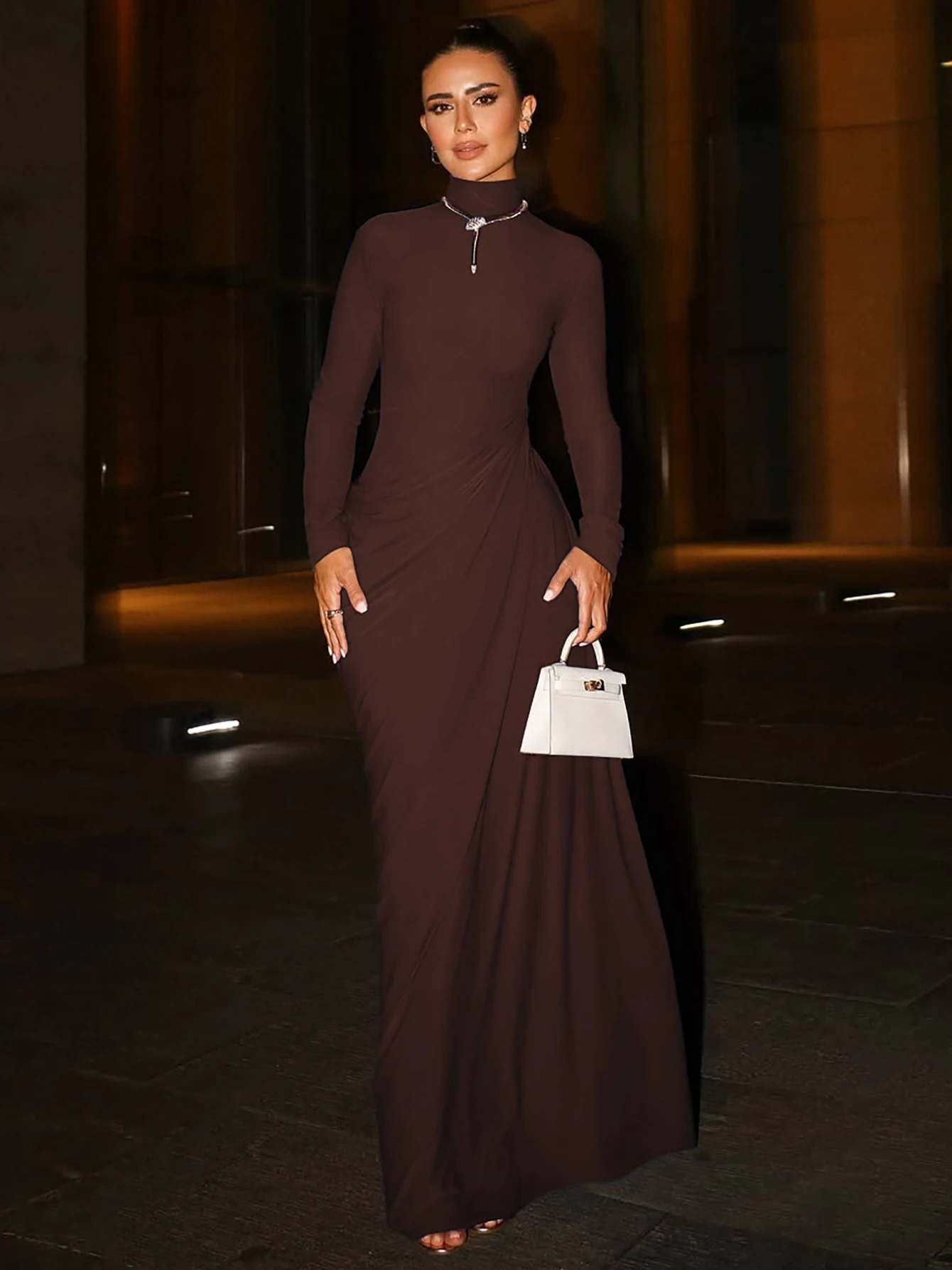 Dulzura Autumn Fashion Elegant High Collar Long Sleeve Ruched Slim Fit Long Dress Women'S Solid Casual Party Club Street Clothes