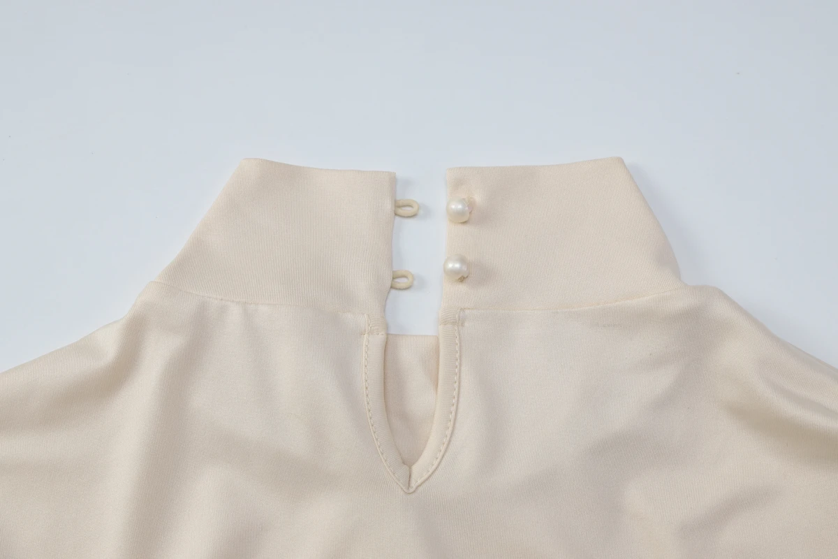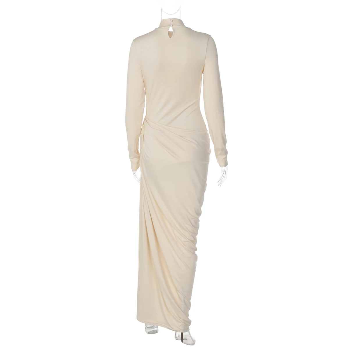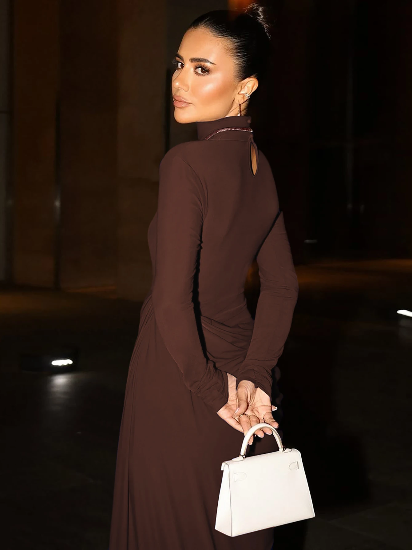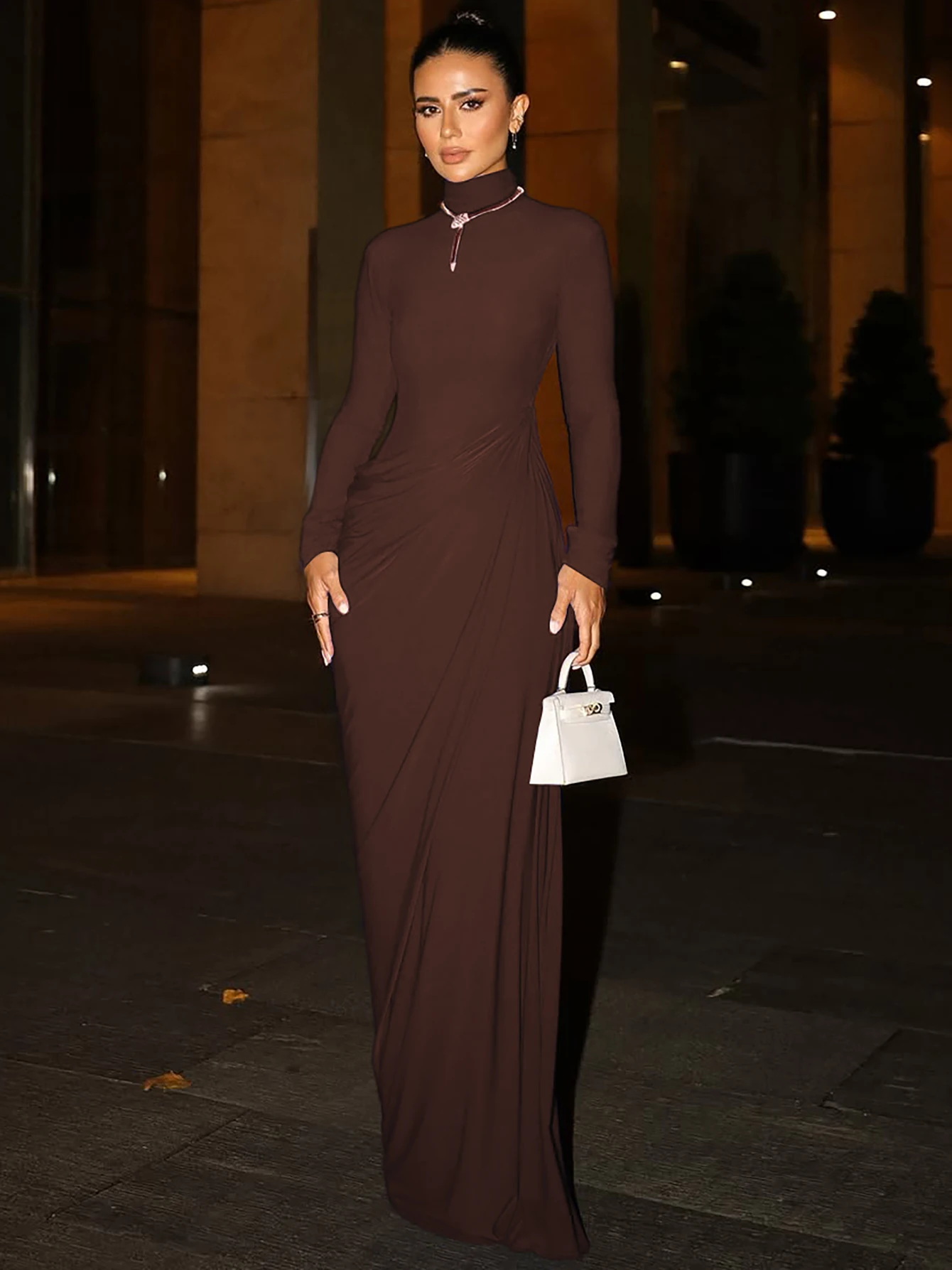 Dulzura Autumn Fashion Elegant High Collar Long Sleeve Ruched Slim Fit Long Dress Women'S Solid Casual Party Club Street Clothes