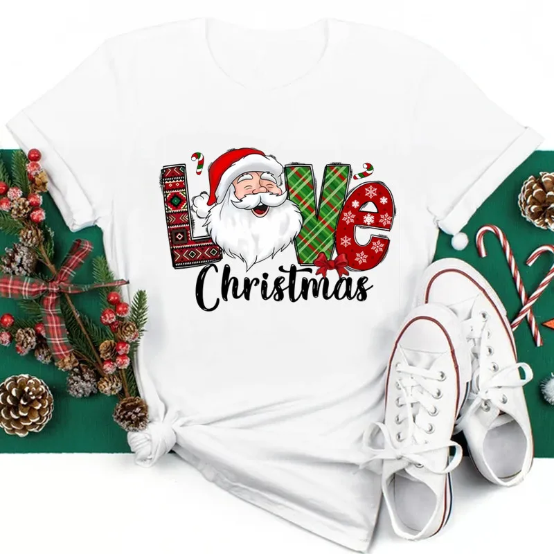 Funny Love Merry Christmas women's Clothes Santa Print Female T-shirts Black red white Casual Women Tops Xmas Party women's Tops