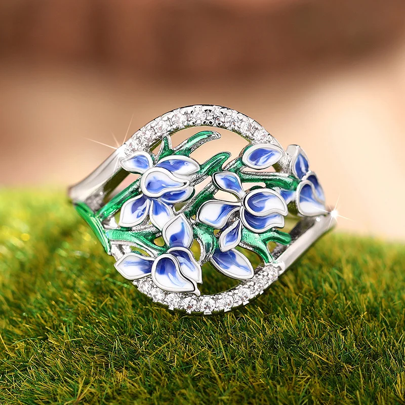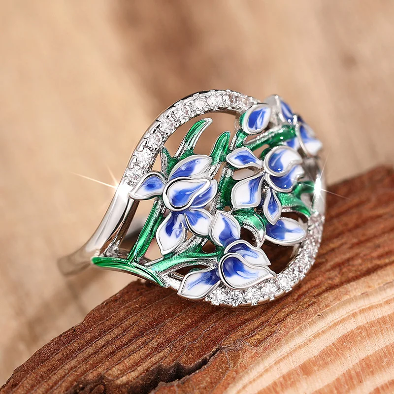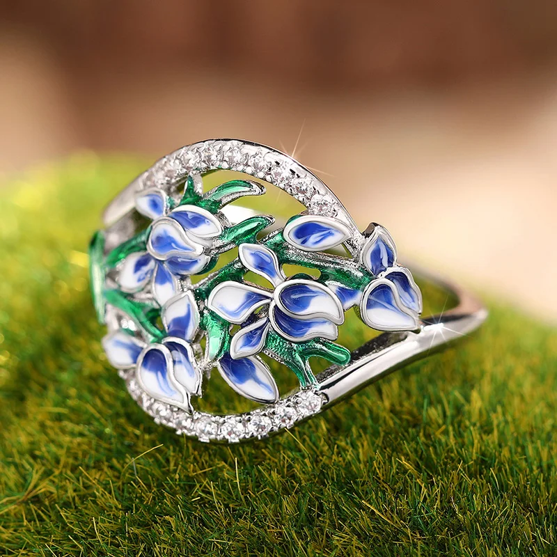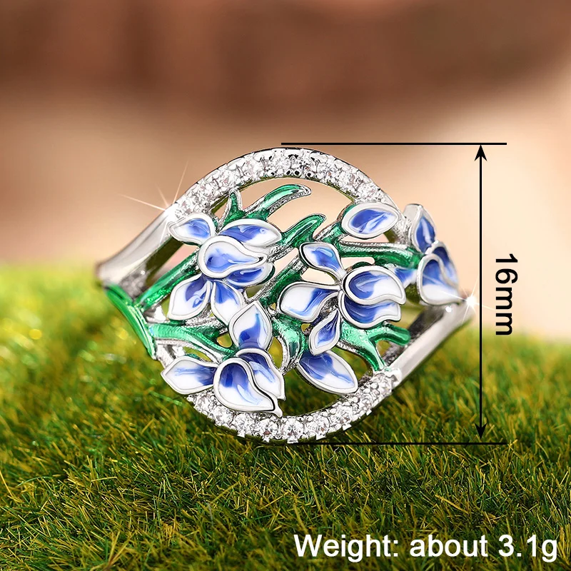 Huitan Blue and White Lily of the Valley Rings for Women Romantic Wedding Accessories Fancy Flower Rings with CZ Fashion Jewelry