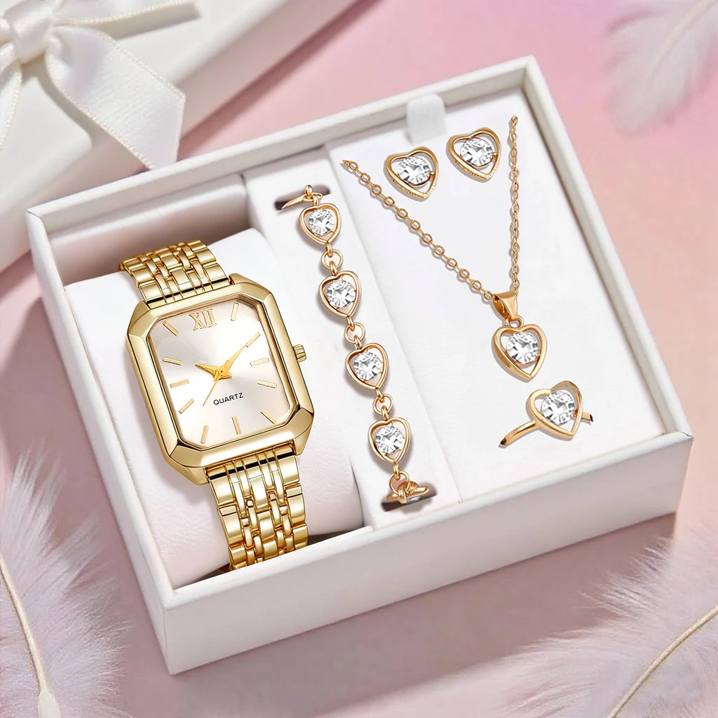 New simple and fashionable women's round dial leather strap quartz watch + exquisite jewelry set Back to school season graduatio