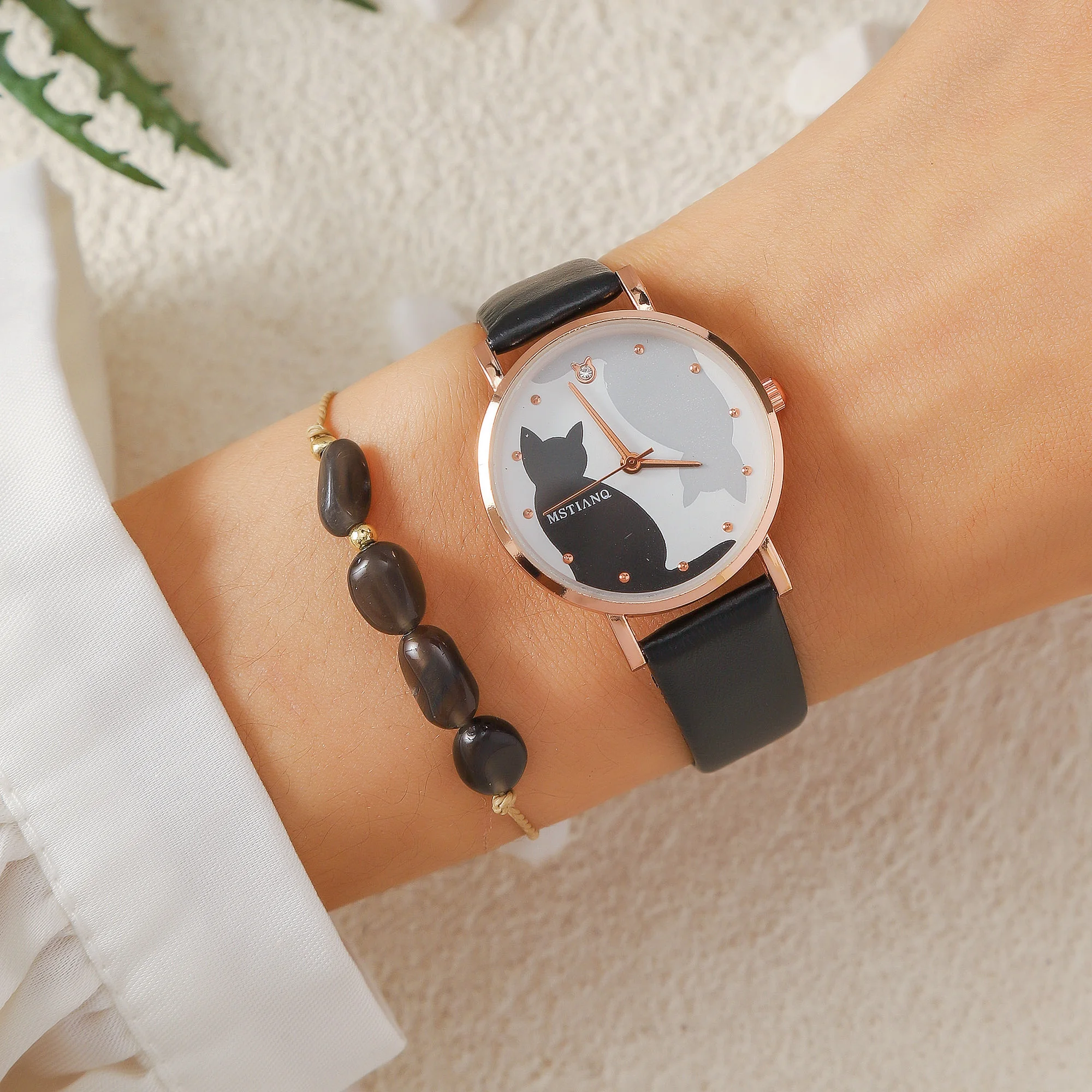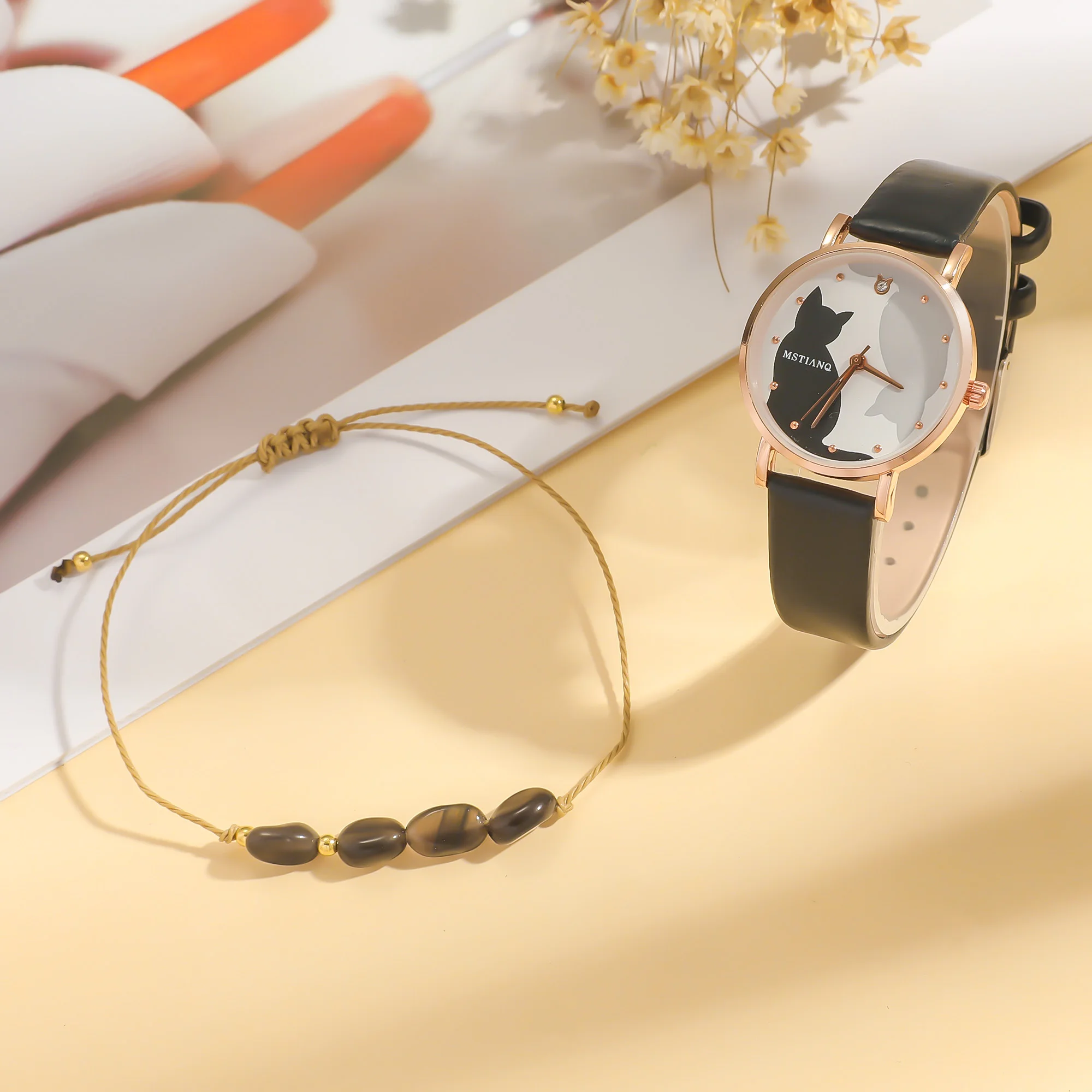 No gift box, popular elegant temperament women's fashion cat watch wristwatch jade stone bracelet 2-piece set