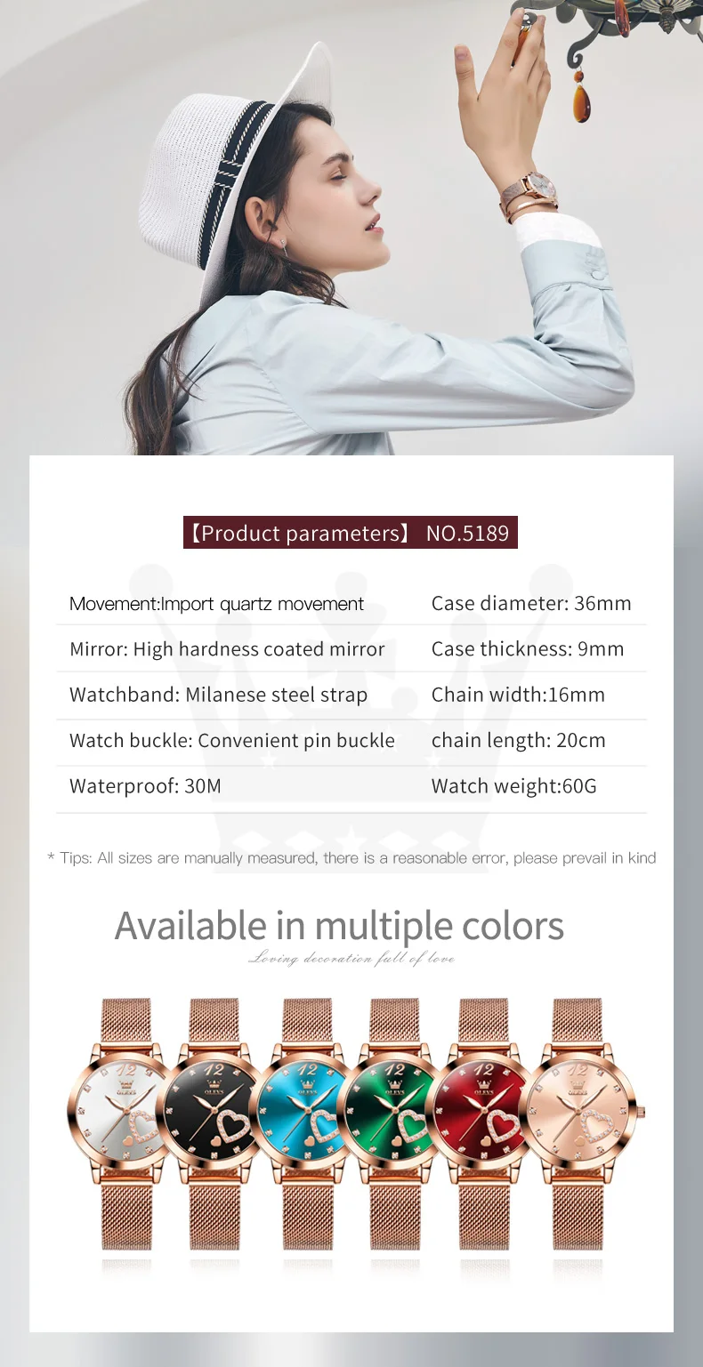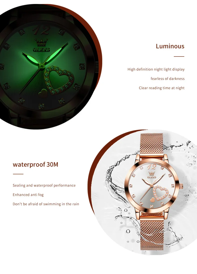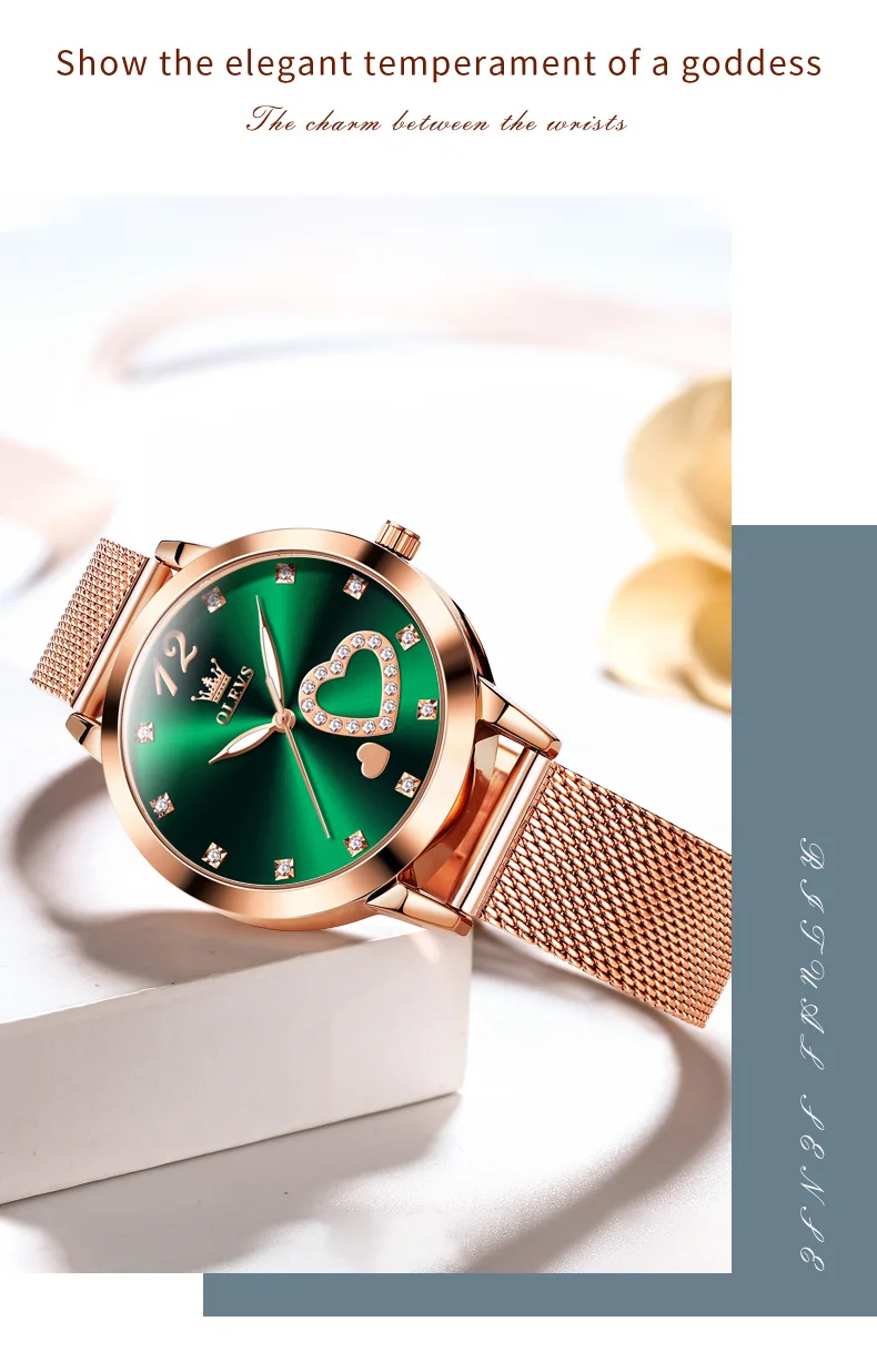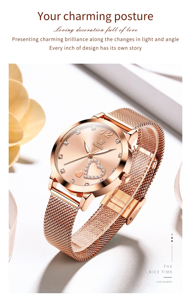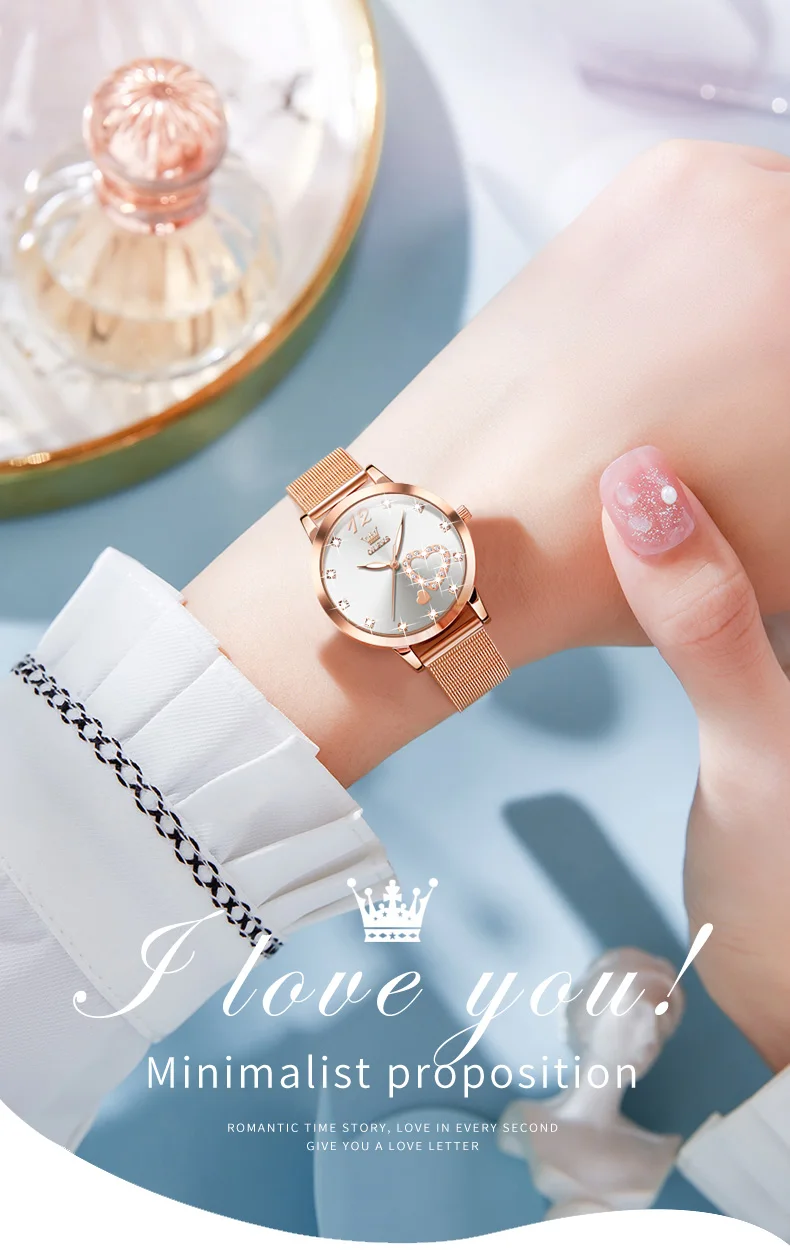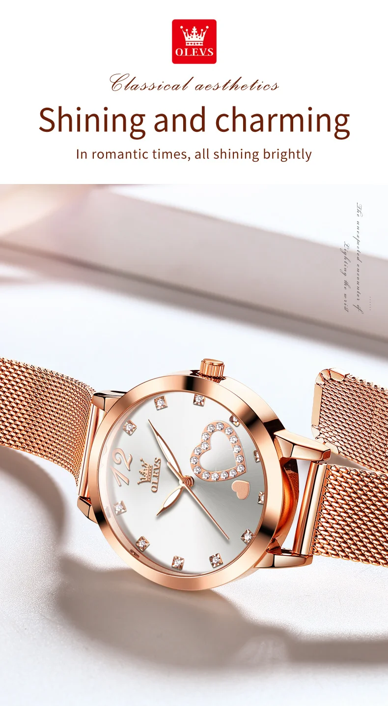 OLEVS 5189 Women's Watch Quartz Wristwatch Casual Fashion Watch for Ladies Waterproof Luminous Mesh Belt Love Dial Zircon Scale