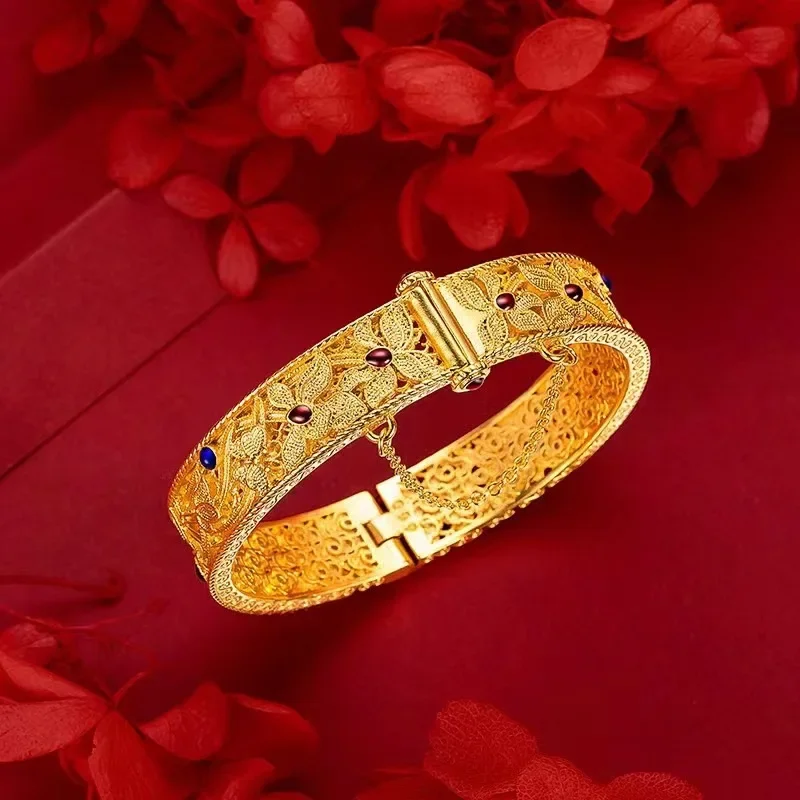 Pure gold 24K gold bracelet AU999 national trend enamel orchid heart retro palace style hollow filigree female jewelry