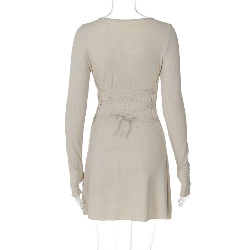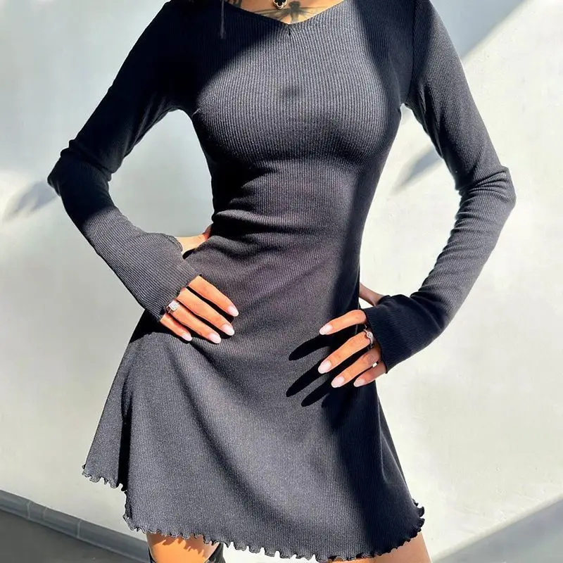 Spring Elegant Pretty Women Dresses New Black Sexy Short Dress Female V Neck Long Sleeve Slim Solid Color Mini Dress