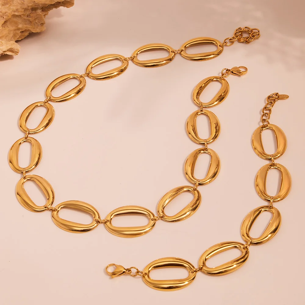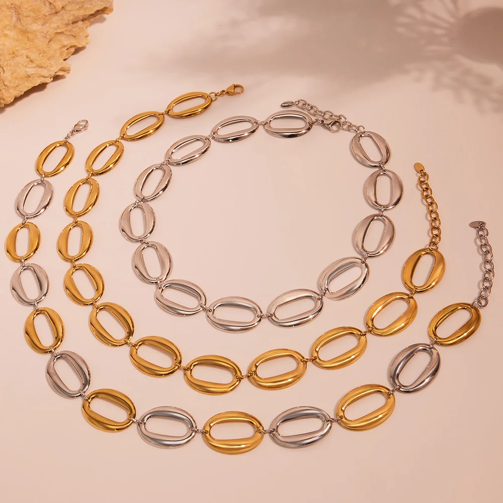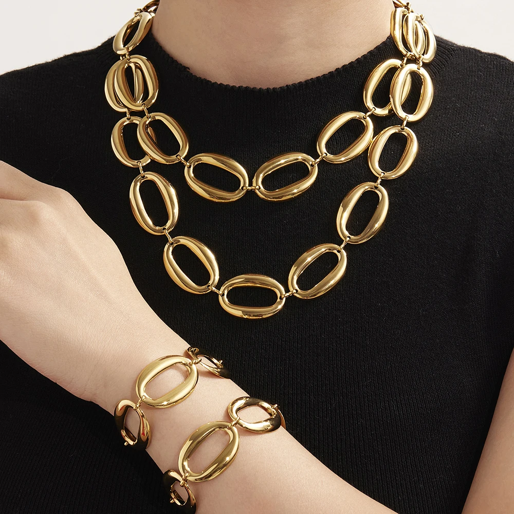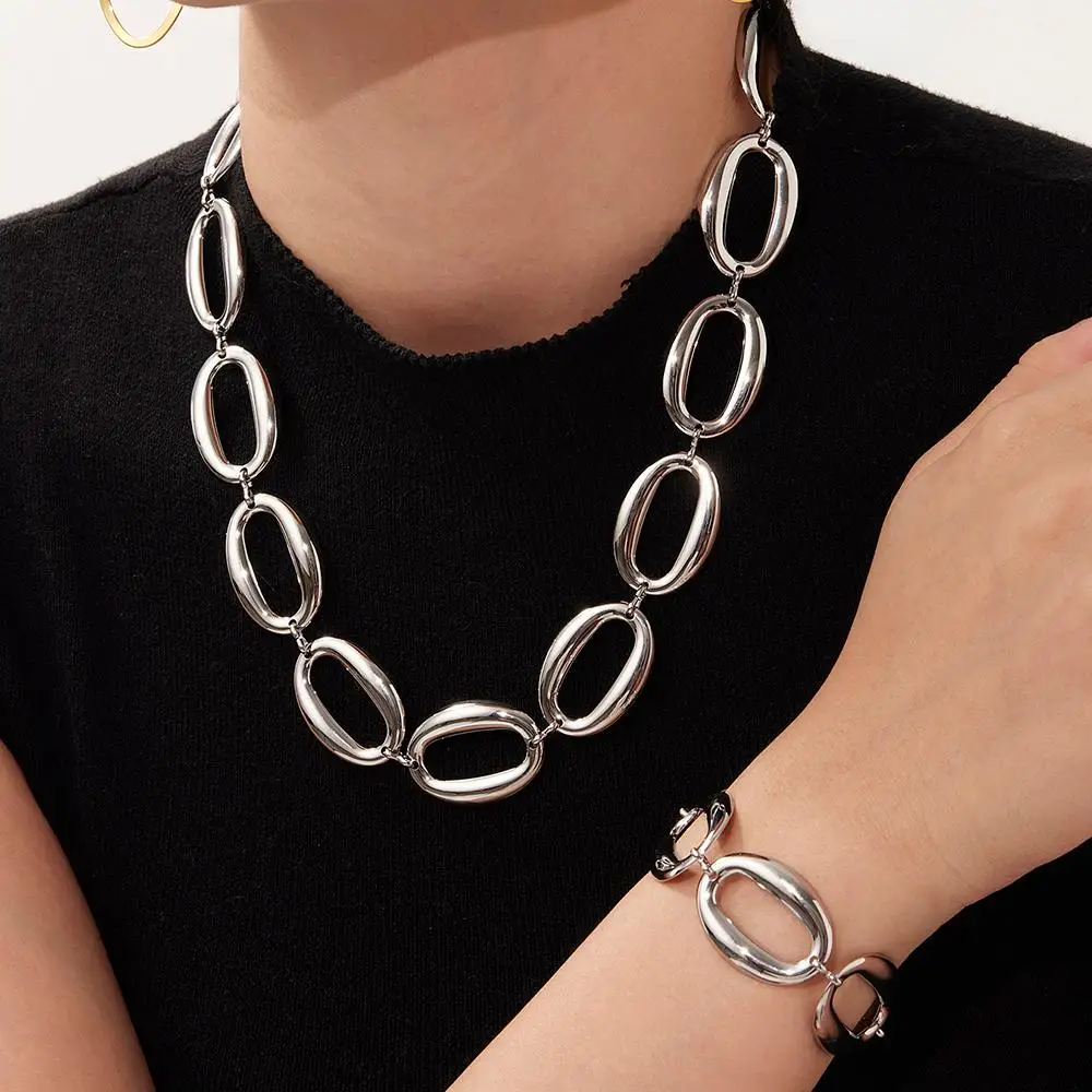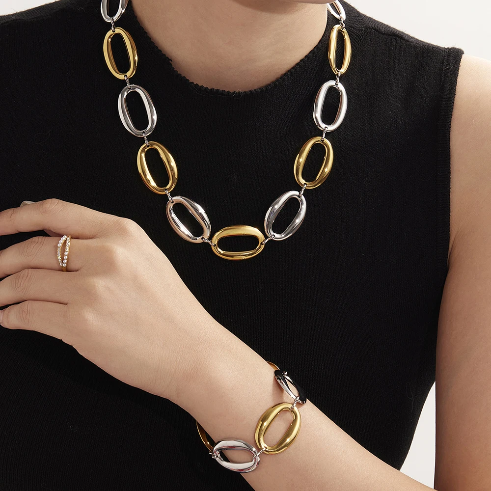 Stainless Steel Gold-Plated Oval Chain Necklace Bracelet Women's Punk Gold Color Silver Luxury Choker Waterproof Jewelry Set