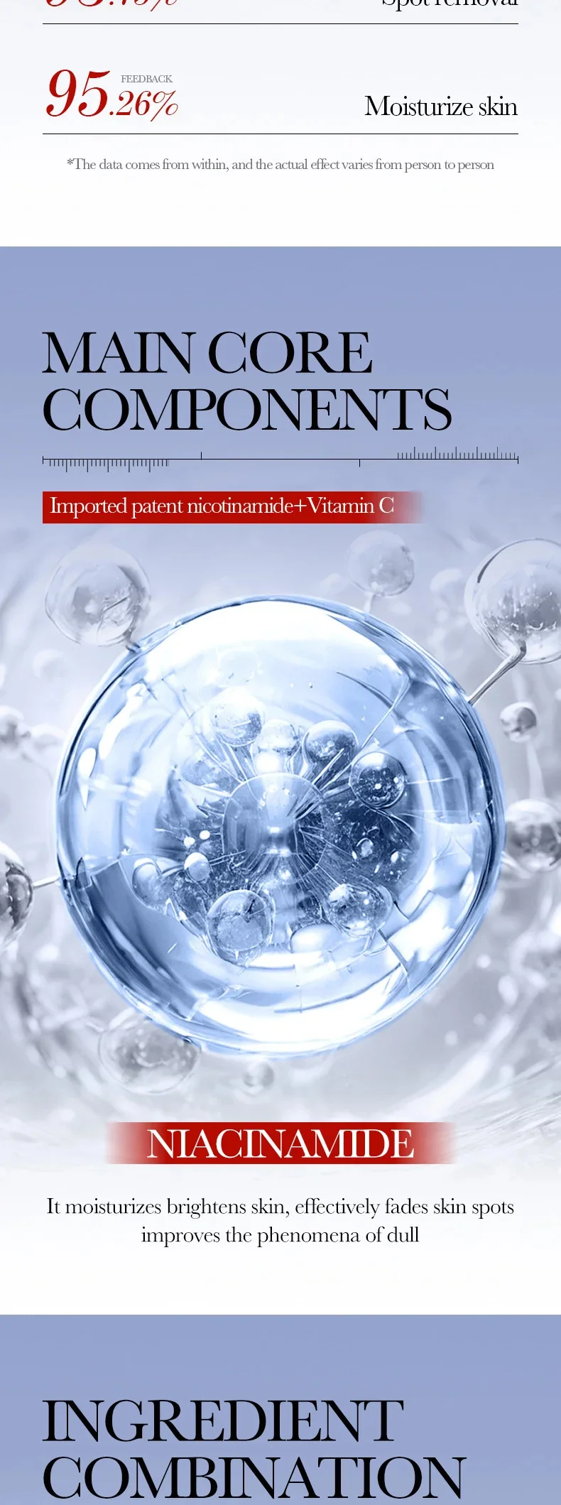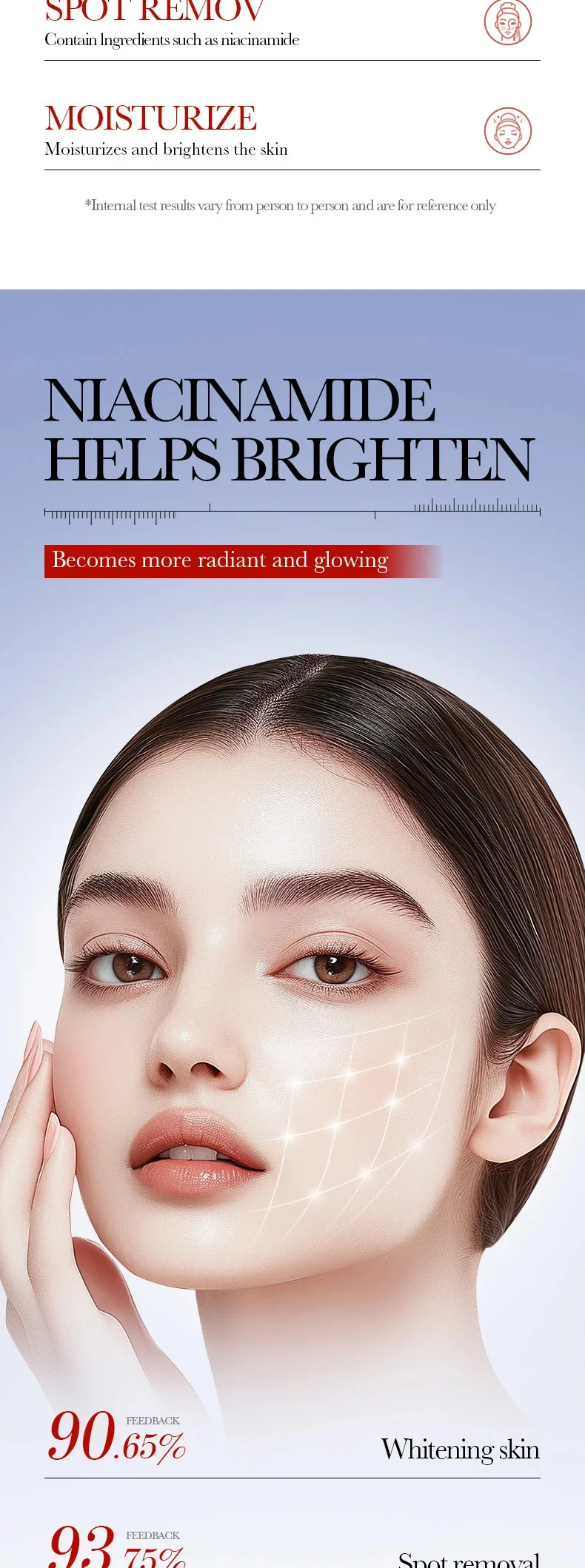 ▶Rich in niacinamide whitening and anti-freckle ingredients, reduce and inhibit the growth of melanin, then help you fade spot defects and improve dullness problem. It can regulate skin cell regeneration and repair ability, giving the incentive to produce melanin, the effective prevention of various kinds of spots regeneration, achieve the skin smooth and delicate, Gentle whitening efficacy. hyaluronic acid, nourishes and moisturizes deeply, help you lock the skin moisture, and makes the skin glow like a baby.